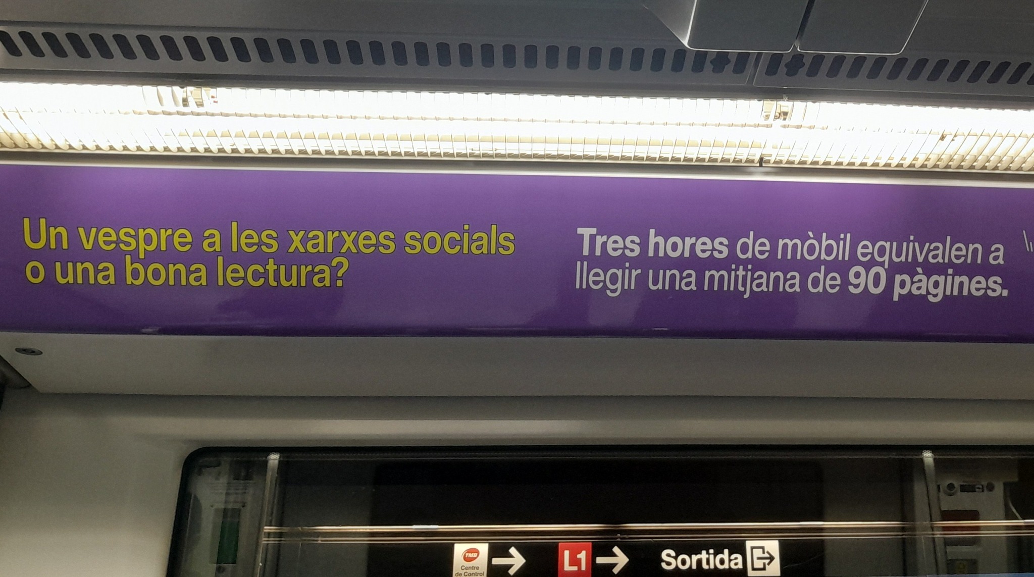 Era una entre tantas frases con las que, allá por abril de 2025, la línea L5 del metro de Barcelona ocupaba los espacios generalmente cubiertos por publicidad privada. Se trataba de una campaña del Ayuntamiento de Barcelona para promover menor uso de redes sociales y más tiempo de lectura de libros.
